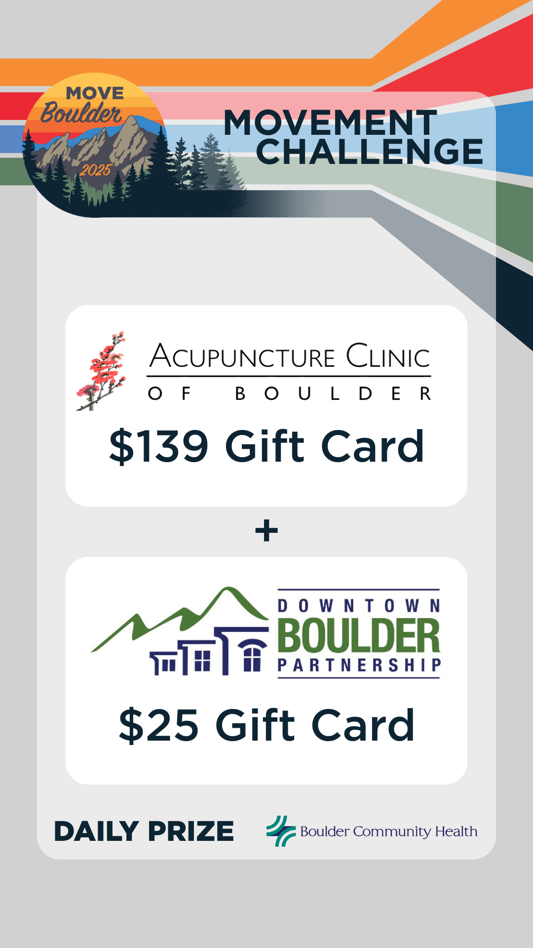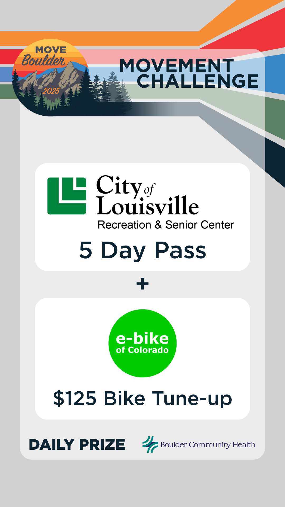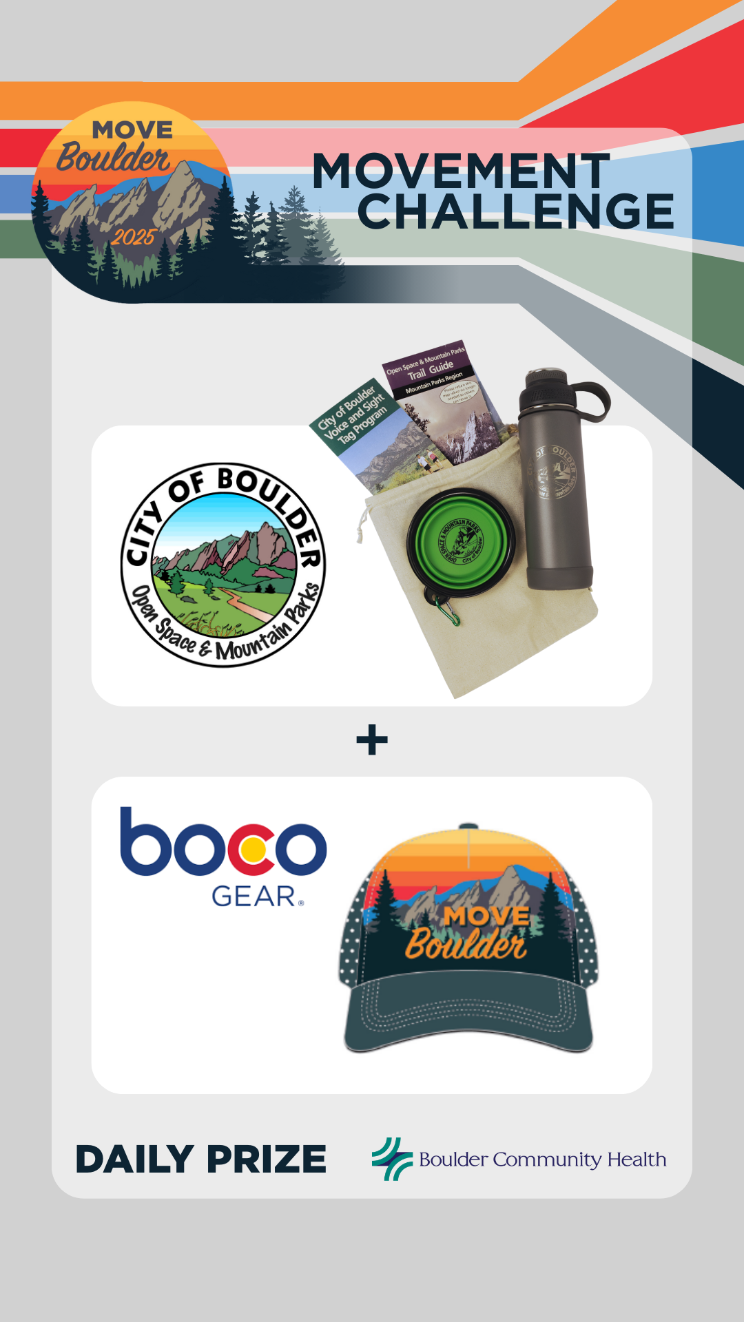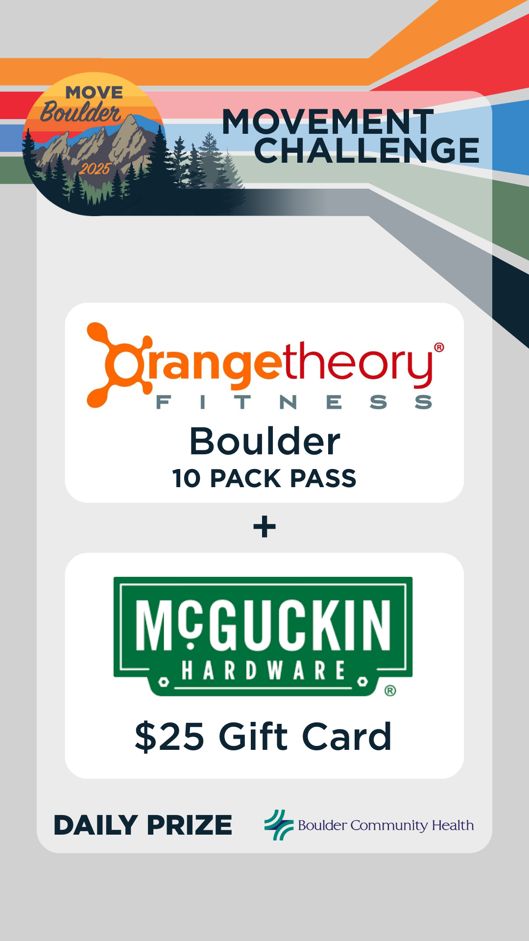 Movement is medicine! Boulder Community Health (BCH) believes in the power of movement to promote physical and mental health, as well as emotional well-being. Our 30-day Movement Challenge is for ANYbody and EVERYbody — all ages and abilities. Sponsored by Boulder Community Health, our 4th Annual Movement Challenge offers you a chance to win daily prizes, for 30 days, all leading up to a grand prize winner of a Suunto Run Lime sports watch and a 2025 Movement Challenge Boco Gear Running Trucker hat!